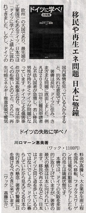 音楽家でも、低周波音が分からない人がいるという。おバカさん、といったかな。添付記事の「ドイツの失敗に学べ」はyoutubeに説明がアップされていた。著者の本はこれまで読んでいるから、おおむねその通りなんだろう。もともとドイツは移民が多いからね、金髪で青い目をしているからって、ドイツ人とは限らない。夢見るドイツ人は有名だ。「またドイツの真似している」とからかわれるから、日本人は気を付けたらいい。